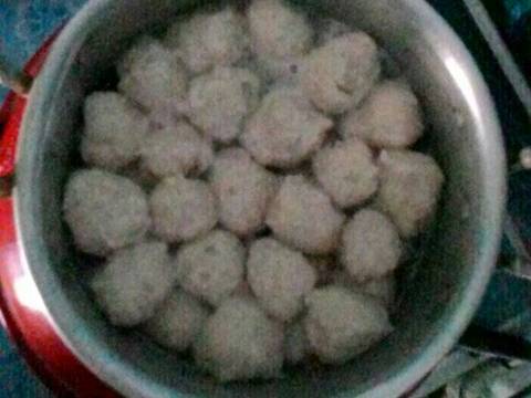 5. Didihkan air,,,,kecilkn apinya(kecil sekali).bentuk bulat adonan dg digenggam tangan dan ambil dg sendok.masukkan hasilnya lngsung dalam panci.lakukan sampai habis.jaga api jgn sampai airnya bergolak.cukup dg letupan tipis2 saja